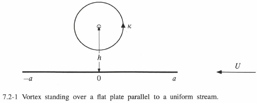 これにより、平板は円に写像され、渦の位置は $\zeta = ih+i\sqrt{a^2+h^2}$ に移される。このとき、複素ポテンシャルは次の形になる。