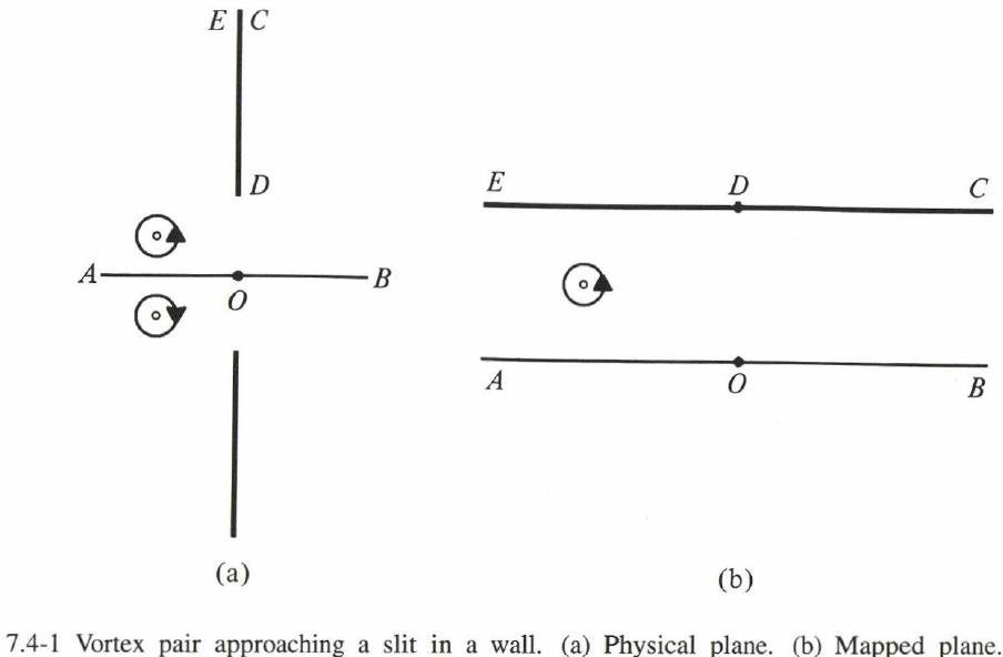 経路関数の応用例として、対称的に配置された、強度 $\kappa$ の逆回転する渦対が壁のスリットに垂直に接近する運動を考えよう(Karweit [975])。図7.4-1を参照。等角写像 $z=\sinh\zeta, z=x+iy, \zeta=\xi+i\eta$ は、上半平面を $\zeta$平面上の幅 $\pi/2$ の帯に写す。チャネル内の渦によって誘起される複素ポテンシャルは第2章で与えている。つまり、