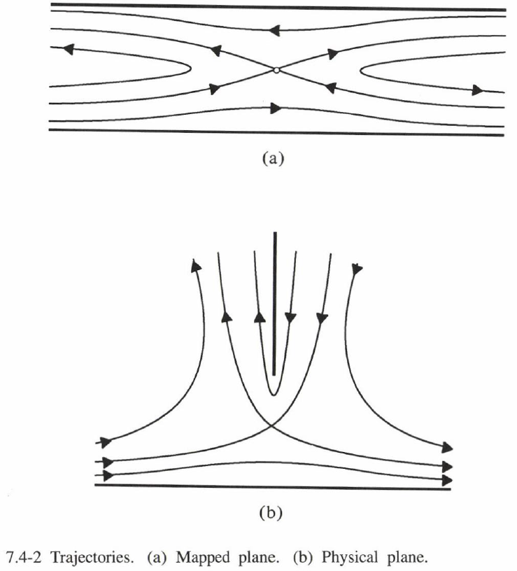 ただし、この解は一意ではない。なぜなら、$w_Q = Q\zeta = Q\sinh^{-1}z $($Q$ は実数) のような付加的ポテンシャル項を(7)に加えることができるからである。これは、スリットを通過する流速 $Q\pi$ に対応する。