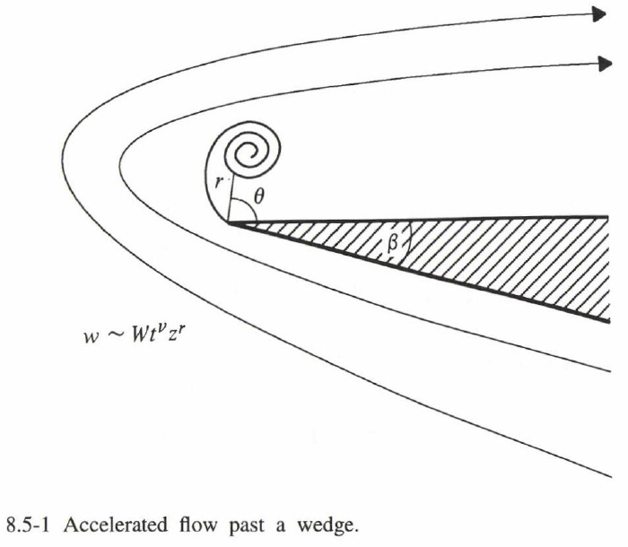 式(1)で表されるタイプの相似解(ただし $m>1/2$ であるためプラントル等角螺旋のクラスには属さない)は、カーデン問題の一般化(Pullin [1978]、Pullin and Phillips [1981])($m=2/3$ の場合)で生じる。図8.5-1(Blendermann [1969])に示すように、角度 $β$ のくさびを通過する加速流れを考えと、渦放出がない場合、複素ポテンシャルは、以下の様になる。