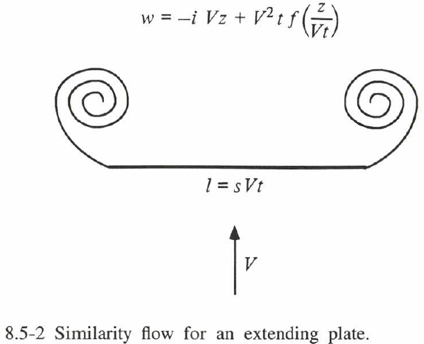 細長いデルタ翼を過ぎる流れの場合、等価な 2 次元問題(Smith [1968]、図8.5-2参照)は、長さが $sVt$ のように膨張する平板に垂直な速度 $V$ を持つ自己相似流れに帰着できる。自己相似速度ポテンシャル $w$ は、($m=1,n=1$ に対応して)以下の形をとる。